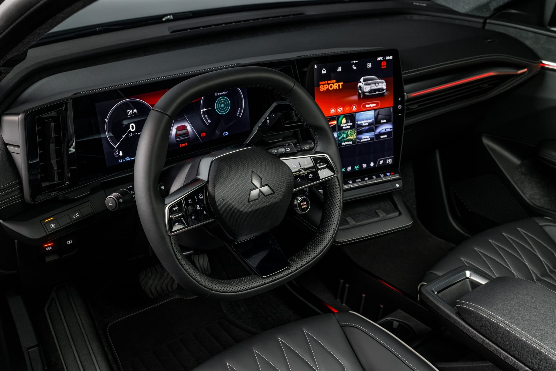 Mitsubishi panostaa vahvasti digitalisaatioon. Keskikonsolissa on 12,3-tuumainen näyttö Google-integraatiolla, ja toinen yhtä suuri digitaalinen mittaristo löytyy kuljettajan edestä.