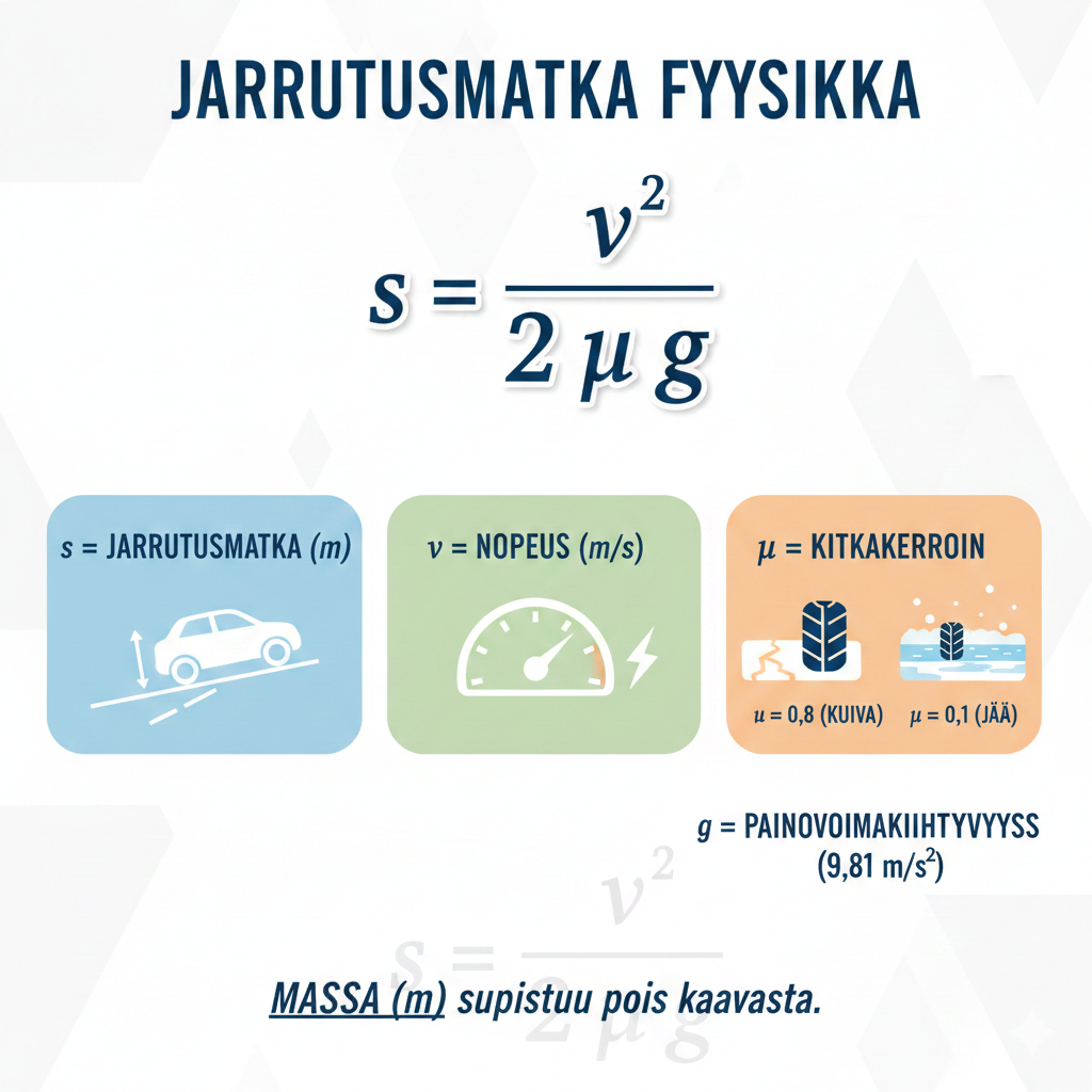 Jarrutusmatka = (nopeus × nopeus) / (2 × kitkakerroin × painovoimakiihtyvyys)