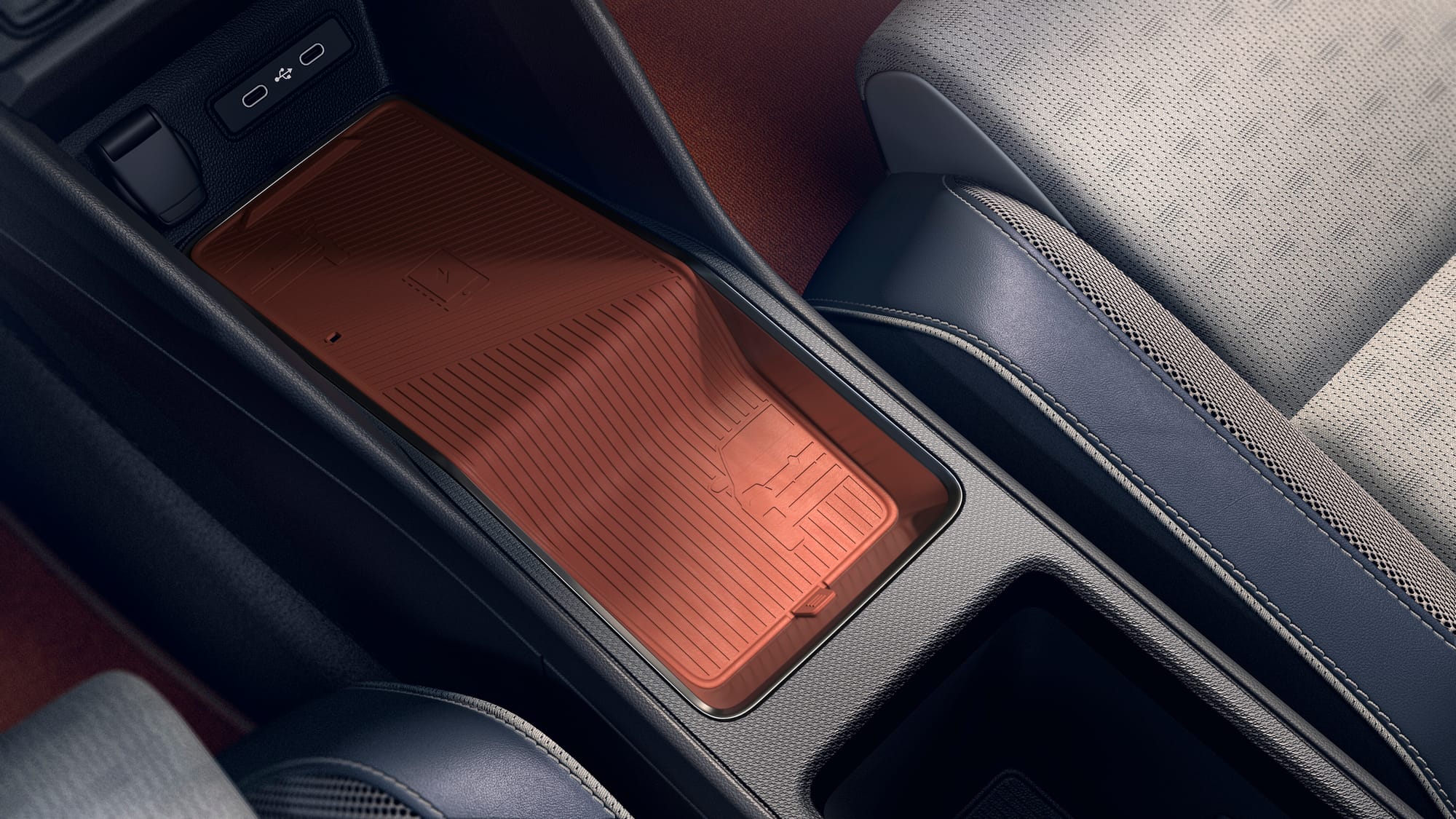 Keskikonsolin langaton latausalusta on puolestaan värjätty muistuttamaan Roland-Garrosin ikonista massakenttää. Jos puhelimesi on siis jatkuvasti "hiekassa", tiedät miksi.