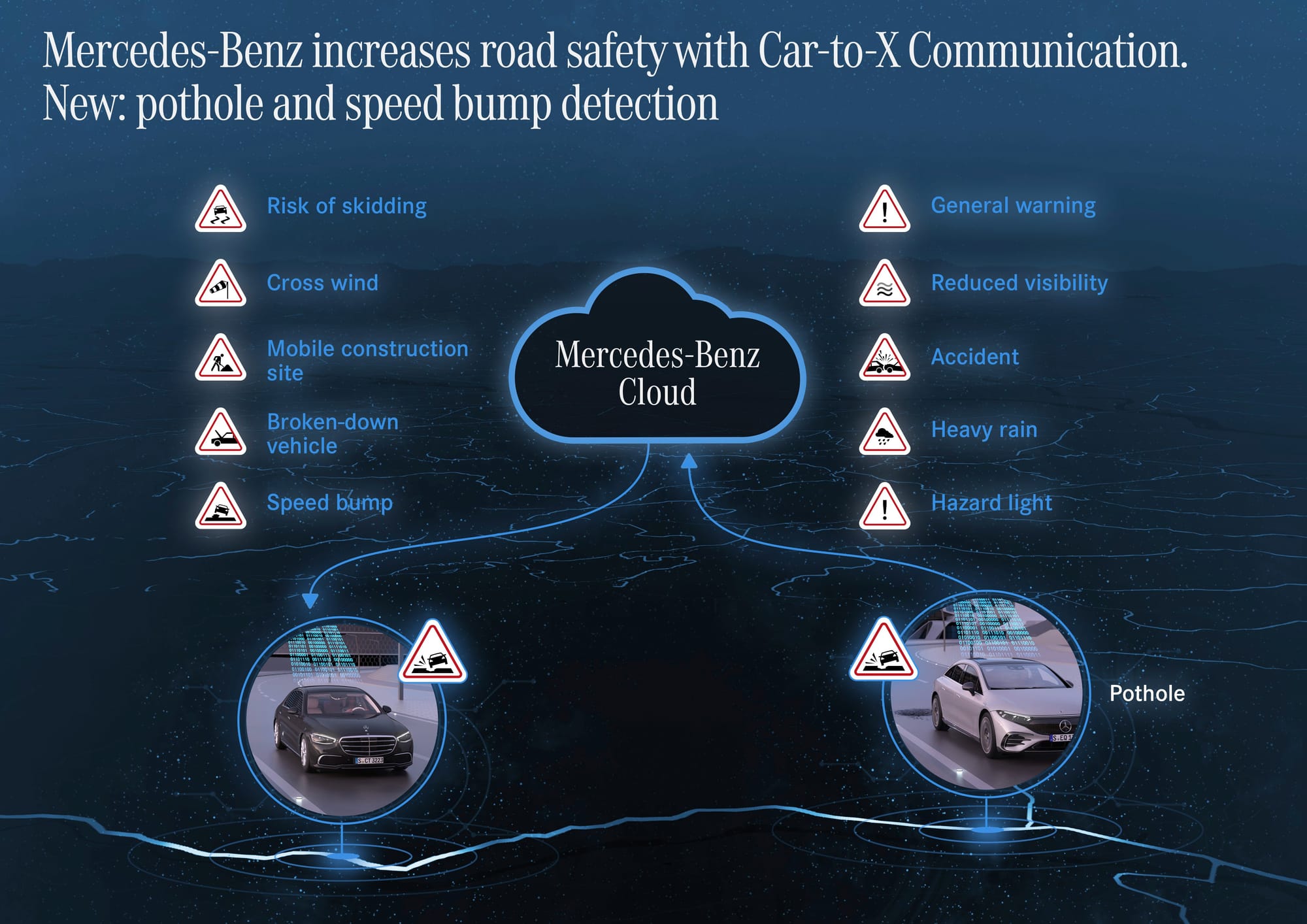Vuoden 2018 jälkeen valmistuneet Mercedes-Benzit pystyvät lähettämään ja vastaanottamaan Car-to-X-varoituksia. Vuonna 2023 C-, S- ja EQS-sarjoista alkaen mukaan lisättiin entistä tarkemmat “Varo kuoppa” ja “Huomioi töyssy” -ilmoitukset.